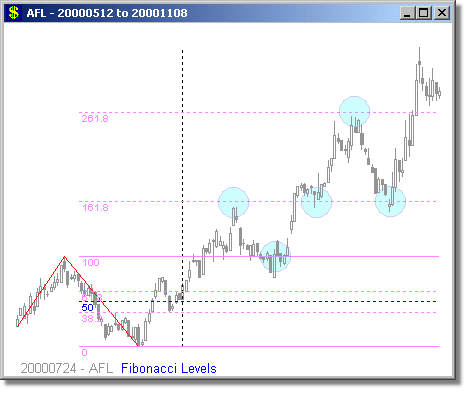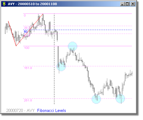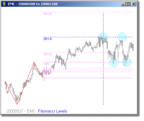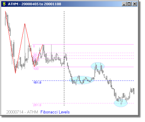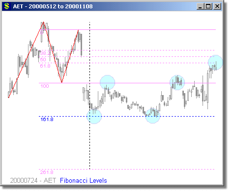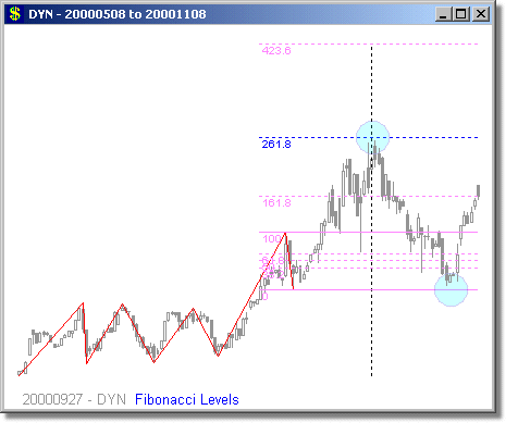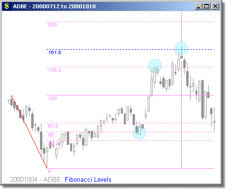 Following are some examples of Fibonacci Level scans with different time periods. We have mostly presented examples showing turning points at 1.618 and 2.618 extensions, because we believe these are the most reliable Fibonacci trades. Note that the Fibonacci levels are determined days or weeks in advance of the actual move. It is rarely possible to predict whether a security will turn at the 1.618 or 2.618 level, but it is prudent to tighten your stops around these points. Furthermore, they are also high-probability trade entry positions, either long or short.