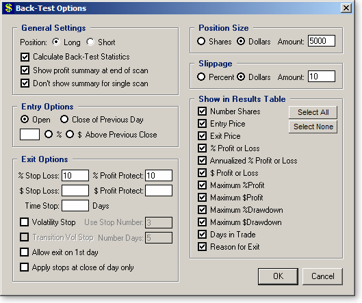 TCScan+ allows you to see how well your scan settings have worked in the past through its back-testing functionality. You specify various trading criteria on a back-test options form and the program uses them to enter and exit positions on each of the items that passes the particular scan you are running. When your scan is complete, a summary of the profitability of all positions taken can be displayed. Individual statistics, like %profit or days in trade, will be listed within the results table.