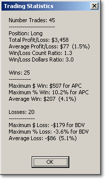 There are two important points to note regarding the back-testing. First, all back-testing statistics are calculated on a daily basis, irrespective of your trading time frame. Second, the only back-test setting that is stored in a settings file is the direction of the trade you want to take, i.e. long or short. All other settings are remembered from your previously-used settings.