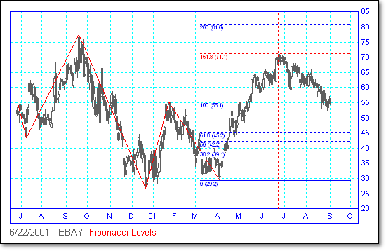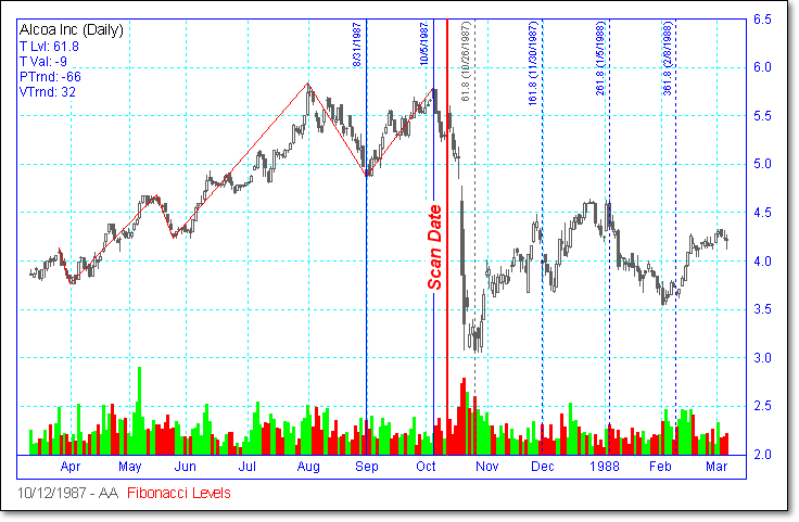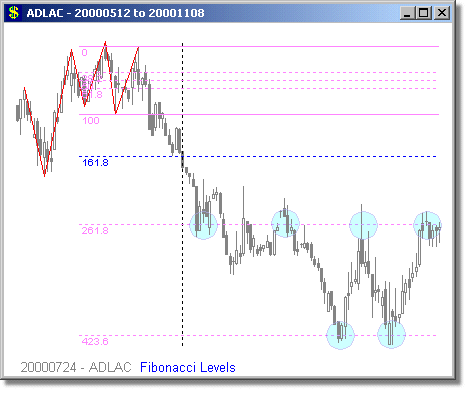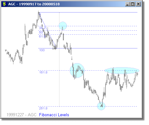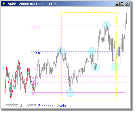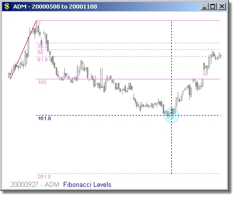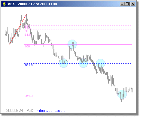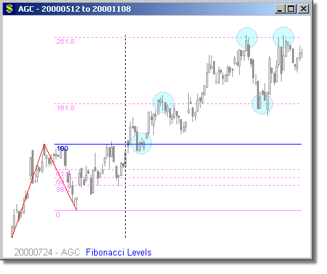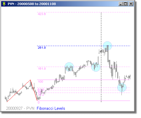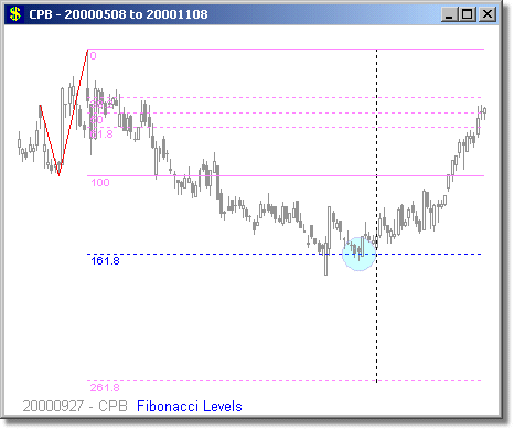 Following are some examples of Fibonacci Level scans with different time periods. We have mostly presented examples showing turning points at 1.618 and 2.618 extensions, because we believe these are the most reliable Fibonacci trades. Note that the Fibonacci levels are determined days or weeks in advance of the actual move. The vertical dotted line shows the day of the scan, and the price curve to the right of it shows what happened on the subsequent days.