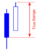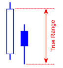 True Range (TR) is the difference between the highest of the bar's high and the previous bar's close subtracted from the lowest of the bars's low and the previous bar's close. The True Range is used in preference to the bar's range (high-low) because the TR takes into account gaps in price. The diagrams below make the definition of TR clearer.