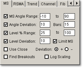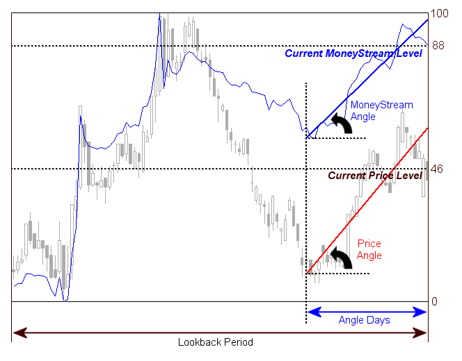 For Angle Divergences, The MoneyStream and Price angles are calculated over the previous number of bars you specify in the box next to Angle Deviation. Upward sloping lines have an angle from 0 to 90 (straight up), and downward sloping lines have an angle between 0 and -90 (straight down.)