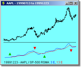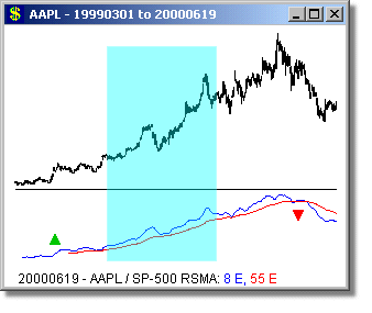 The Worden Brothers favor watching 10 and 40 day simple RSMAs, but we have found wider-spaced moving averages more effective - you should experiment and see what suits your trading style best. We like to use Fibonacci numbers as periods for our indicators, typically separating the one period from the other by two Fib numbers. So for example on a short-term basis we would watch a 3 day RSMA versus a 13 day RSMA, and for longer-term trading would watch a 13 day RSMA versus a 55 day RSMA. You could choose other combinations from the Fibonacci series: 1, 2, 3, 5, 8, 13, 21, 34, 55, 89, 144, etc. As an example, see the use of 8/55 RSMAs on the long-term chart of AAPL versus the use of 3/13 RSMAs during short-term moves.