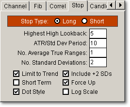 Limit to Trend Checking this box will tell TCScan+ to only show stops appropriate to the trend, i.e., it will only display long stops when the trend is up, and short stops when the trend is down. When this box is checked, then the box below it, Short Term, becomes enabled. Checking this box will get TCScan+ to consider shorter-term trends in deciding whether to show stops or not, while leaving it unchecked will get TCScan+ to consider longer-term trends for the display. |