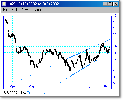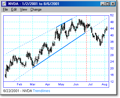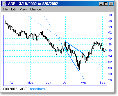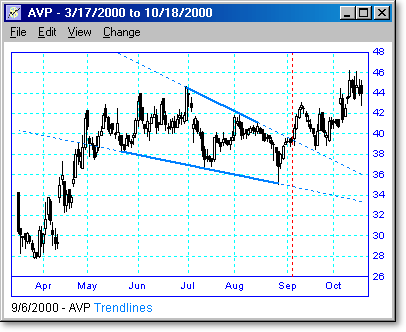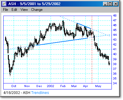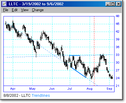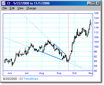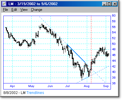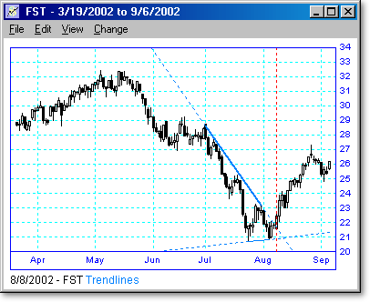 Following are some examples of trendline scans with different lengths and periods. The vertical dotted line shows the day the scan was run, and the points to the right of the line show what happened when the trendline was broken or touched. We believe that trendline breakouts are one of the highest probability trades there are.