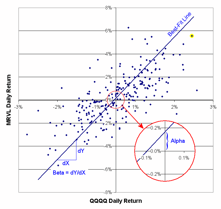 You can see that, on average, MRVL has larger daily changes than QQQQ does. This is illustrated by the slope of the line or Beta, which for the time period shown is 3.53. This means that, on average, the daily return of MRVL is 3.53 times the daily return of QQQQ. In contrast, Alpha is the Y intercept of the best-fit line, and estimates how much MRVL would change on a day when the QQQQ was flat (because it is the position of the best-fit line when the QQQQ return is 0.) In other words, alpha is the excess return of MRVL over the QQQQ or, how much extra daily income you could expect by investing in MRVL versus QQQQ. In this case the alpha is 0.17%, which annualizes to 41.9% (as would be shown in the results table.)