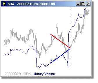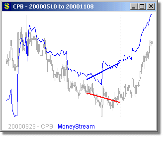 strong positive divergences in levels and/or angles in MoneyStream™ and Price
