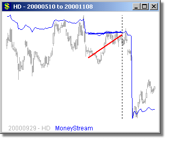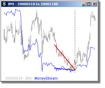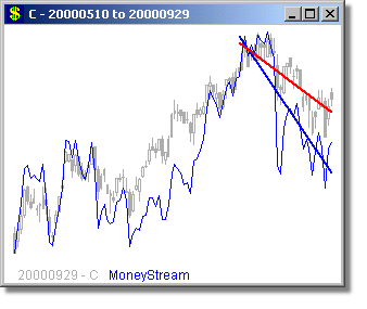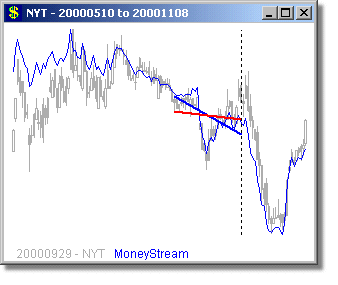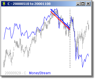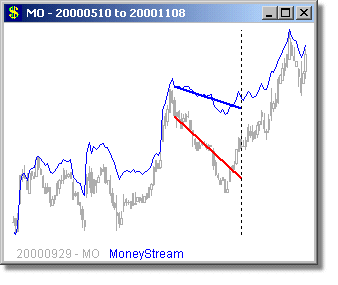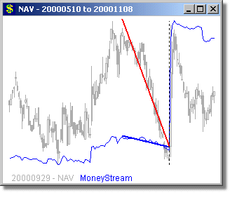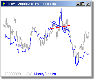 Following are some long and short examples from a MoneyStream™ Scan for September 29, 2000. We chose this day, because the DJ-30, SP-500 and COMPQX indexes were all poised for major drops from this day through Mid October - yet a MoneyStream™ divergence scan still found very good long candidates on this day (as well as short ones too). MoneyStream™ is shown in Blue and Price bars in Gray, with the Price angle line in Red. The vertical dotted line shows the day of the scan, with the plot to the right of this line showing what happened over the next 20 days.